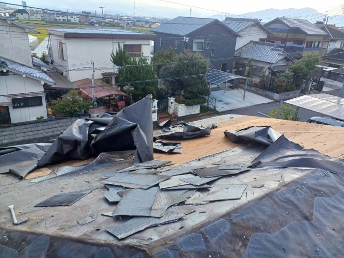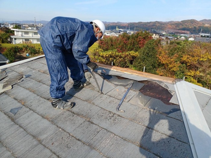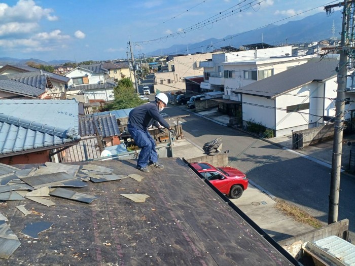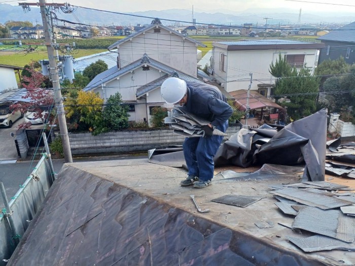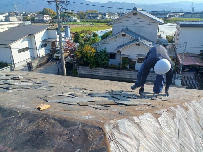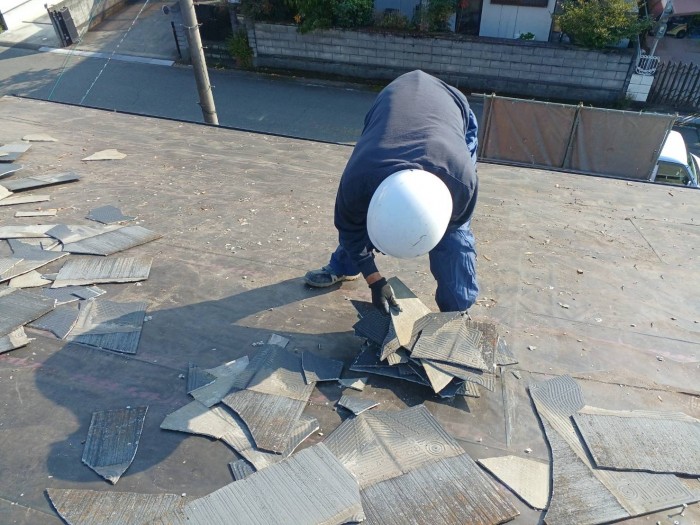 引き続き2棟目瓦撤去作業、取り置きヤードへ搬出作業しております。