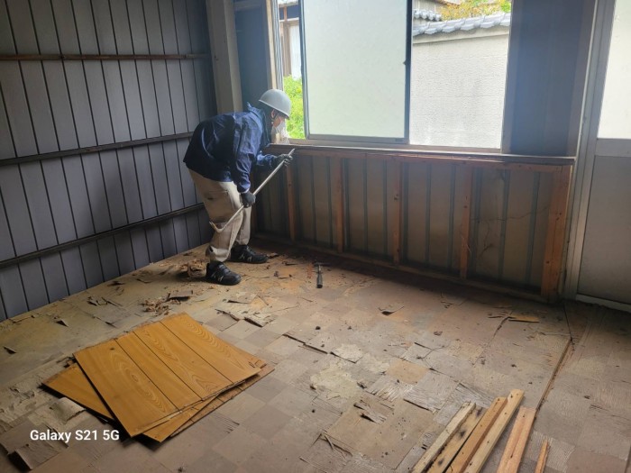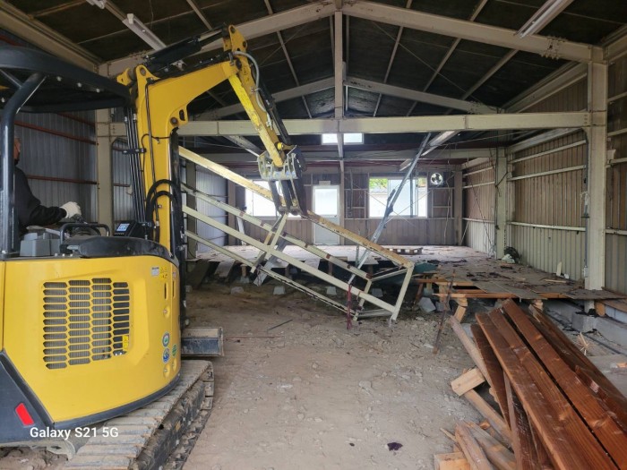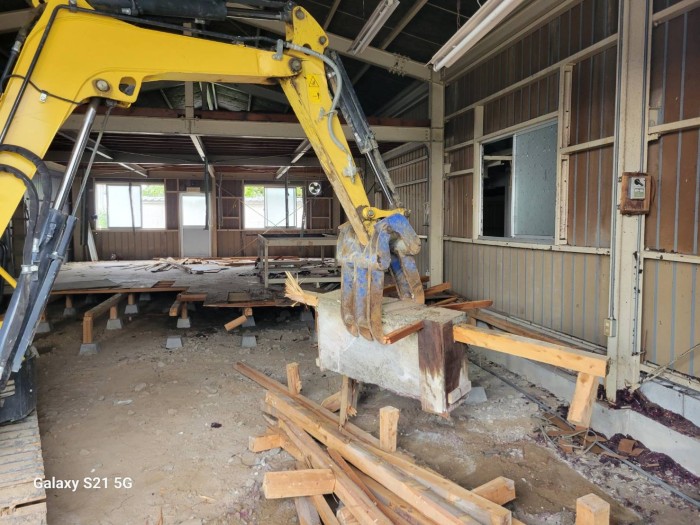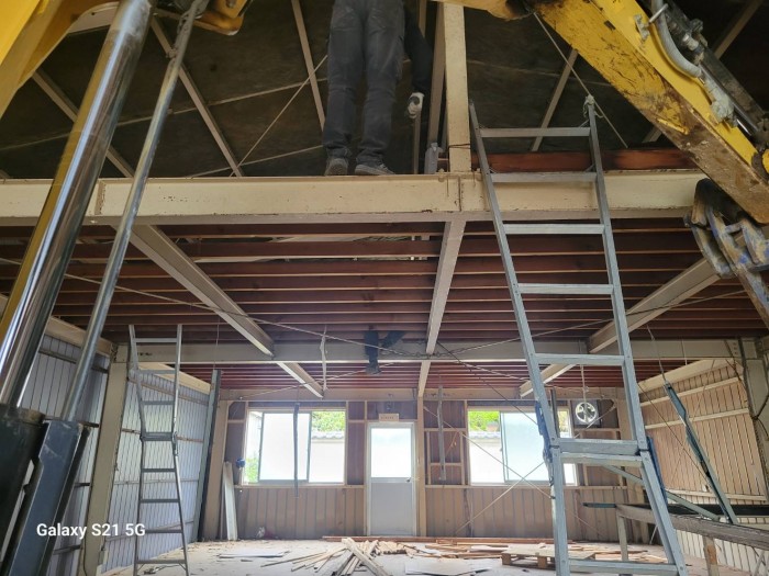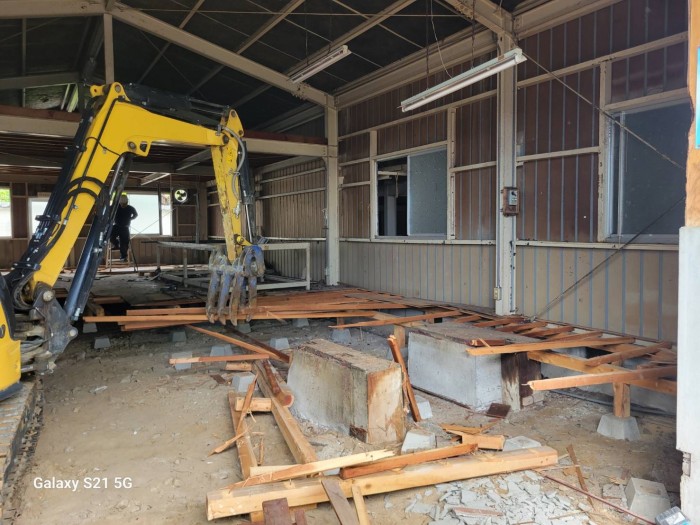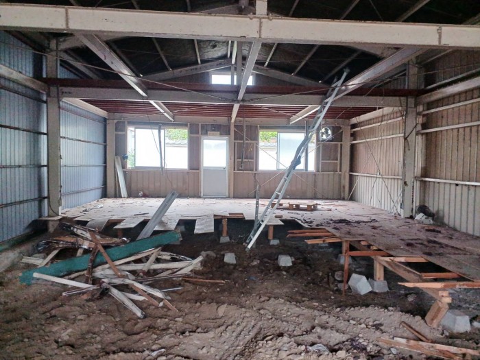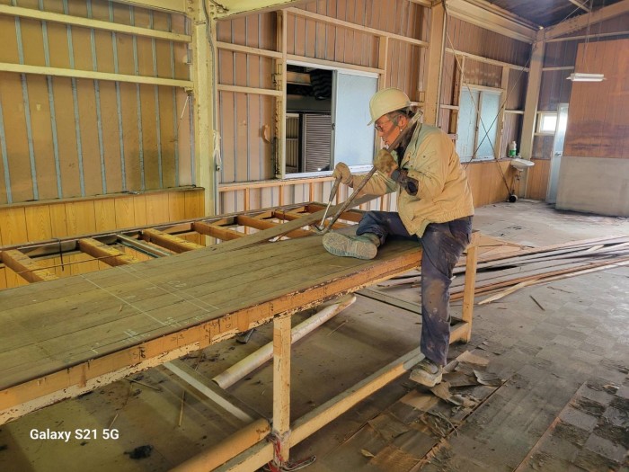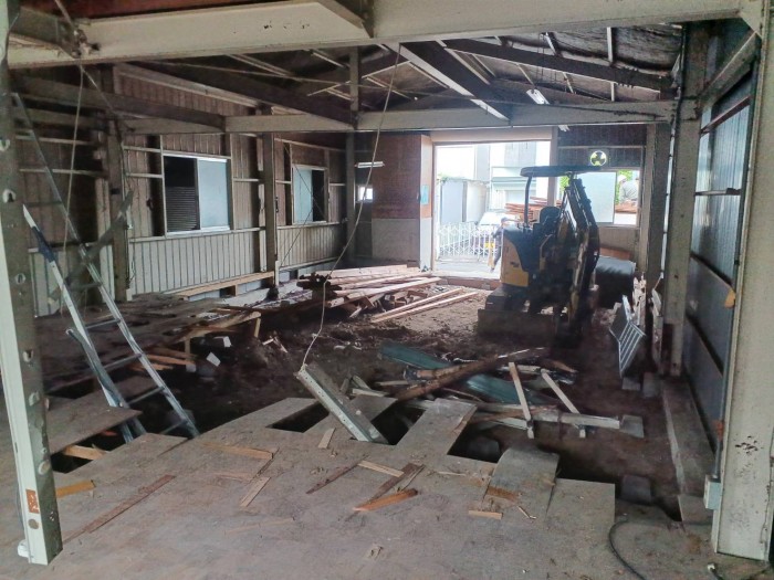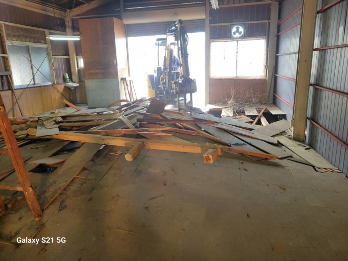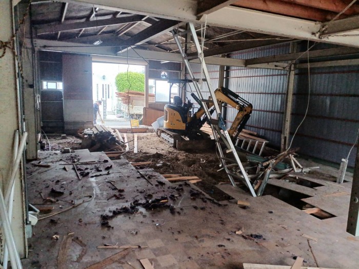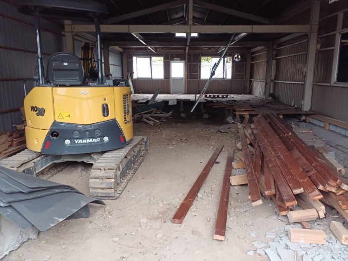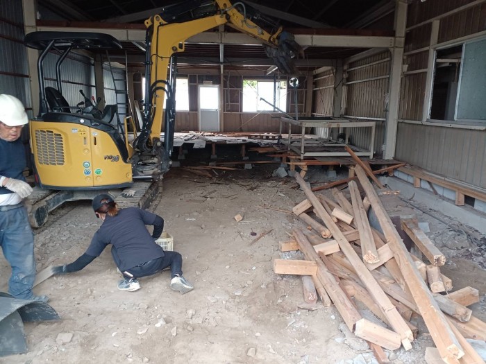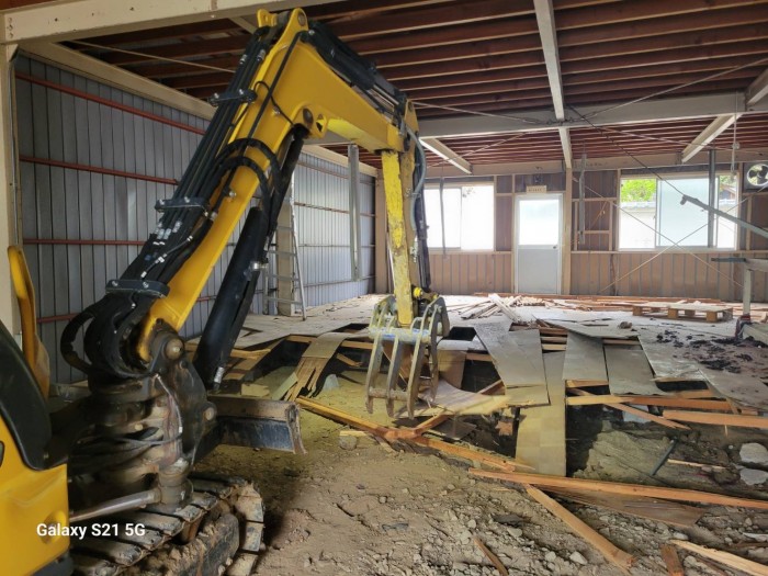 着工して既設床撤去作業、廃材積み込み搬出作業しております。