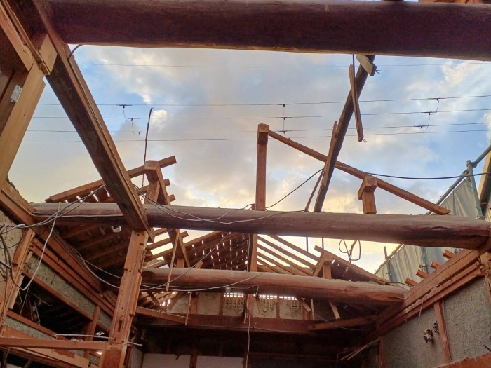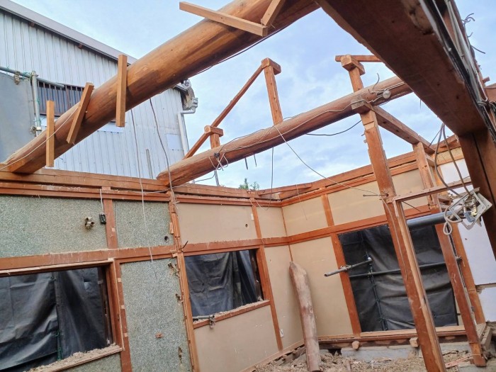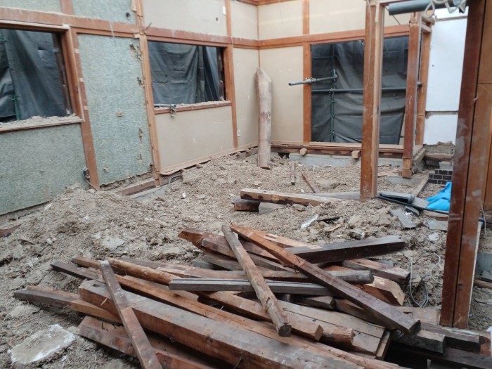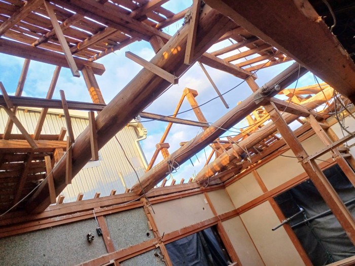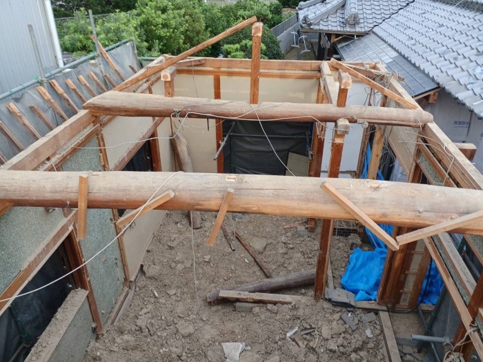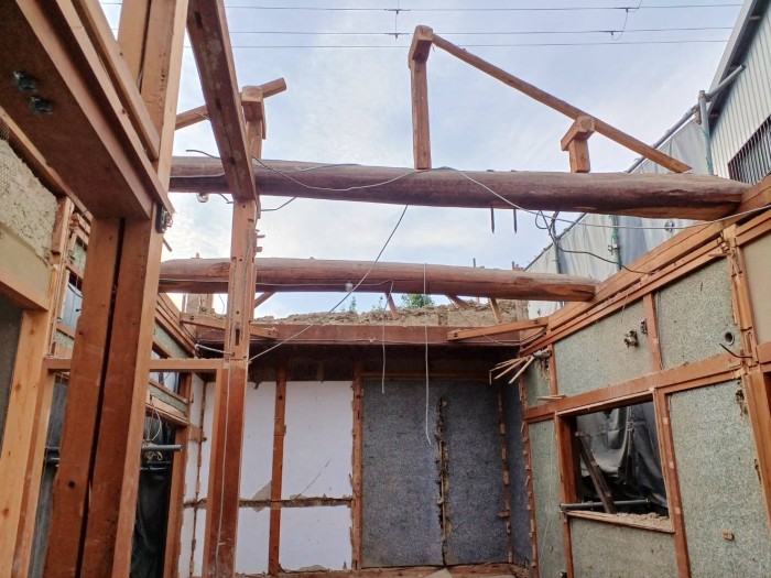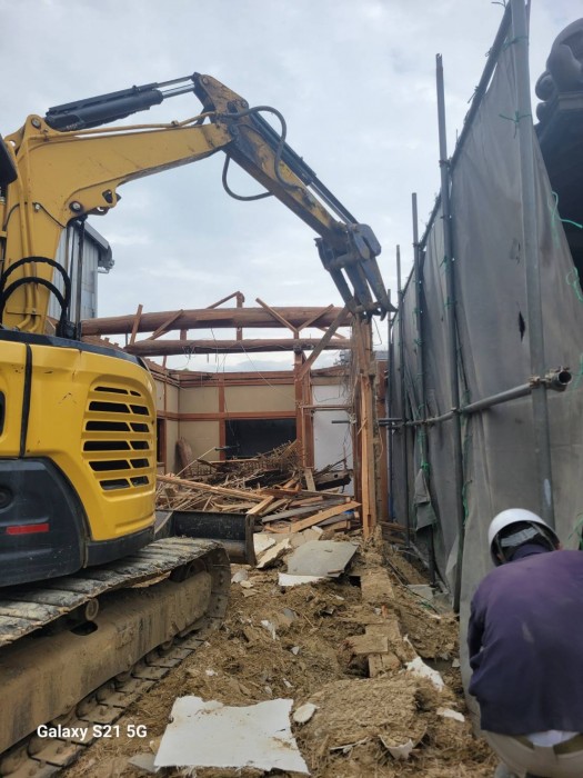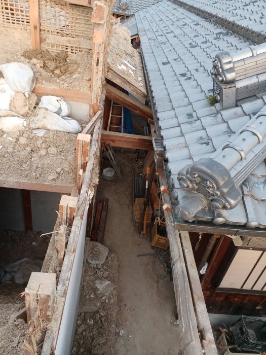 和歌山県紀の川市北勢田地内リフォーム改修工事 本日屋根撤去完了内側母屋境界部足場養生組み立て作業しています。 2025年10月18日(土) 18:48 | カテゴリー:外構工事(新設、リノベーション工事),施工実績,解体撤去工事,解体撤去工事