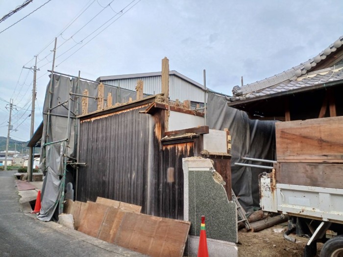 和歌山県紀の川市北勢田地内リフォーム改修工事 着工して基礎縁切り解り、足場組み立て、土塀解体撤去作業しております。 2025年10月8日(水) 18:32 | カテゴリー:外構工事(新設、リノベーション工事),施工実績,解体撤去工事,解体撤去工事